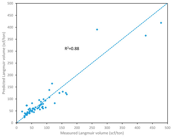 The relationship between the measured and predicted Langmuir volume at experimental temperature.