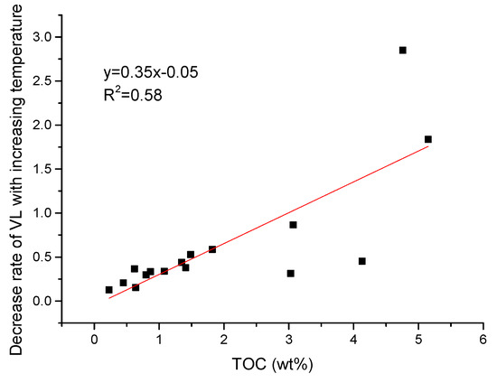 where is the Langmuir volume at reservoir temperature, scf/ton; T is the reservoir temperature, °C; d and e are the fitting coefficients. The value of the trend-line slope, d, is described as the decrease rate of Langmuir volume with increasing temperature, which quantitatively describes the temperature effect on the Langmuir volume. It has been concluded that the methane adsorbed on the organic matter is more sensitive to the temperature than the methane adsorbed on the clay minerals [6]. The finding is also confirmed in Figure 6, which displays a positive relationship between the TOC and decrease rate of VL, with the R2 of 0.58. With this relationship, the decrease rate of VL (d) can be calculated based on the TOC using Equation (5):