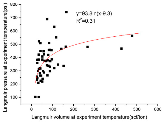 Langmuir pressure is also required to calculate the methane adsorption capacity in actual reservoir conditions. The reciprocal of the Langmuir pressure represents the affinity of the gas for sorbent. It has been concluded that the adsorption affinity on the organic matter is stronger than that on clay minerals [6]. Thermal maturity and volume of small pores were also regarded as controlling factors of the Langmuir pressure [5,10]. Herein, the Langmuir pressure shows no trend with the thermal maturity, TOC or clay content, but a logarithmic-law trend exists to the Langmuir volume, with R2 of 0.31 (Figure 7). The low correlation might result from the sensitive and various controlling factors of the Langmuir pressure. The shale sample with a large Langmuir volume has a high Langmuir pressure, which represents a weak adsorption affinity of methane. As reported, the organic matter and small pore have stronger adsorption affinity of methane comparing to the clay and large pore, respectively. In this case, the adsorption affinity of methane in shale reflects the proportion of adsorbed methane in the small pore and organic matter. Thus, the weak adsorption affinity in the shale sample with a large Langmuir volume might infer that the proportion of adsorbed methane in the small pore and organic matter is low. Since the relationship between the Langmuir volume and Langmuir pressure is obtained from a large amount of data, the relationship can be informative. Therefore, the Langmuir pressure can be predicted using the following equation: