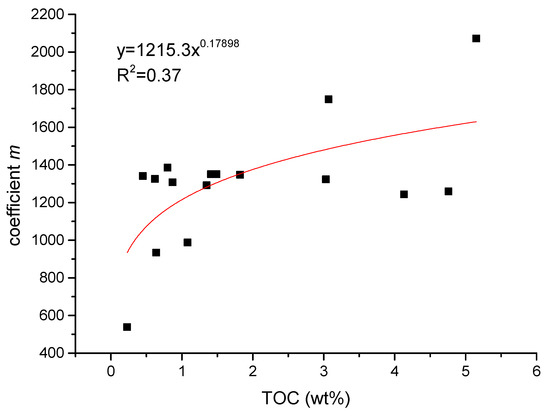 where m and n is the fitting coefficient, resulting from the thermal dynamic parameters: the heat of adsorption and the standard entropy of adsorption. These parameters have been compared between the organic matter and clay minerals, concluding that the methane adsorbed on the organic matter releases more heat than the methane adsorbed on clay. A linear relationship between the heat of adsorption and the standard entropy of adsorption has been proposed for different types of kerogen, clay and shale samples at different thermal maturity [5]. It might imply that the thermal dynamic parameters are related to the TOC. For each shale sample, the coefficient m and n are determined using linear fitting on and . In terms of the studied samples, the plot of m with TOC is listed in Figure 8 as the following equation: