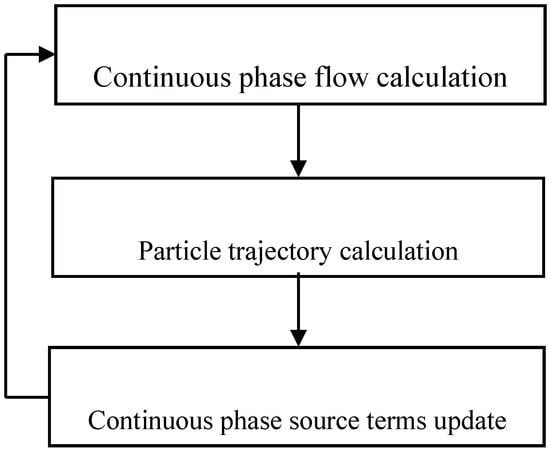 For the spray development simulation, DPM was used to capture the flow of vapour formation and the atomization phase. The Navier–Stokes equations and continuity equation were solved to compute the continuous phase, whereas the force balance on the particle was integrated into the solver to calculate the trajectories of particles. For a two-way interaction, the continuous phase was calculated based on the Eulerian model, whereas the particle trajectories were calculated based on the result of the continuous flow. The two-way coupling of process scheme is shown in Figure 1.