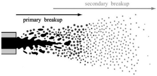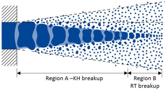 The model for the primary breakup is established according to the combination effects of Kelvin–Helmholtz (KH) waves directed by aerodynamic forces with Rayleigh–Taylor (RT) instabilities that caused secondary breakup [35], as shown in Figure 3. In region A, the KH instability caused the droplet to break from the liquid phase; meanwhile, in region B, the RT instability caused the secondary breakup to happen.