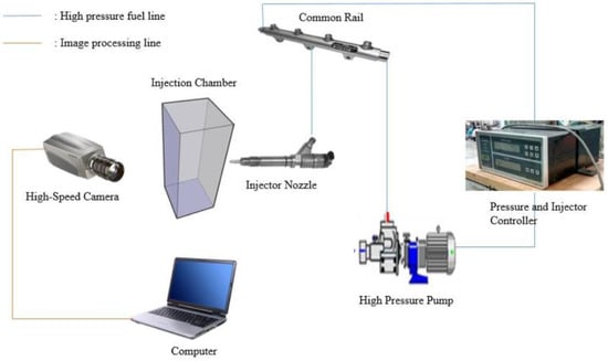 Figure 5 depicts the spray test platform diagram for investigating the diesel and hybrid biofuel spray characteristics. The spray test platform consisted of Chevrolet Captiva common rail injection system and an Olympus high speed video camera system. The common rail injection system consisted of a high-pressure pump, pipes, electromotor, and a solenoid type six-hole nozzle (Siemens A2C2002584). Different high injection pressures were achieved at the pump by using the electromotor. A solenoid type six-hole nozzle was mounted at the middle of the injection chamber with a dimension of 30 cm × 30 cm. The images of the spraying moment were recorded using Olympus i-SPEED 2 high speed video camera.