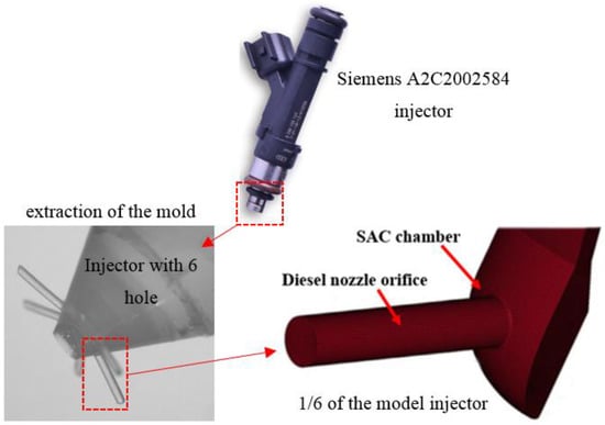 A six-hole diesel fuel injector (Siemens A2C2002584) was chosen with nozzle angle of 150°. In order to save computation time, only a single nozzle out of six nozzles was modeled from the evenly distributed injector. The injector diagram and geometry of the nozzle model is shown in Figure 6. In this study, three types of nozzle shape—circle, elliptical A, and elliptical B—were evaluated. The type of injector spray nozzle shape used in this study and the dimensions are summarized in Table 2.