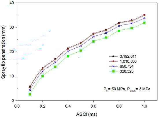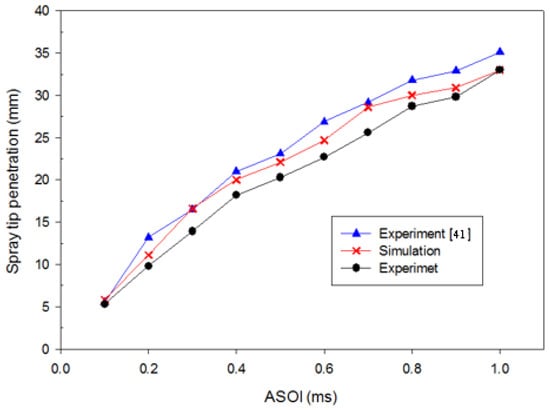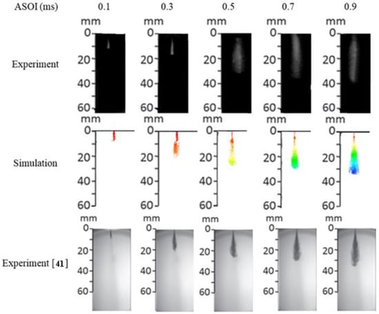Figure 9 presents the simulation and experimental spray characteristic of a 50 MPa injection pressure and 3 MPa backpressure with a 0.16 mm circular nozzle shape. As shown in Figure 9, the spray characteristic between experiment and simulation were nearly identical at the same ASOI. However, our experimental work has a small deviation between simulation and the experiment from Yu et al. [41] due to the poor resolution of the high-speed camera. Furthermore, it can be found that the experimental spray characteristic shows a coarse pattern at the nozzle exit due to difficulty for the experimental work to capture the small structure in the spray. Nevertheless, the numerical technique was useful to replicate the macro scale characteristics of the spray. Additionally, the quantitative results of spray performances are analyzed in the next section.