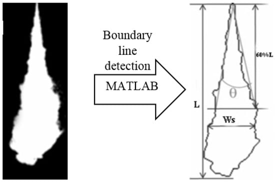 The experimental data obtained from the 3-D injector flow and spray simulation were limited due to the cover inside the injector and dense spray cloud formations. Hence, based on the method presented above, a simulation system was developed with ANSYS Fluent. For verification purposes, the experimental results of Yu et al. [41], which used diesel fuel with the same material properties and operating conditions as in the present numerical study, were compared with the simulation results. Furthermore, our experimental results were also included in the results. The operating conditions for the setup were 50 MPa and a backpressure of 3 MPa with 0.16 mm of circular nozzle shape. In this research, the method to calculate spray cone angle was proposed by Pastor et al. [42]. The MATLAB software was used to process the captured spray images from both experiment and simulation and the images were converted into boundary lines as shown in Figure 8, where θ is the spray cone angle, L is the spray tip penetration, and Ws is the widths of the spray cloud, which were denoted as a length between the spray cloud borders.