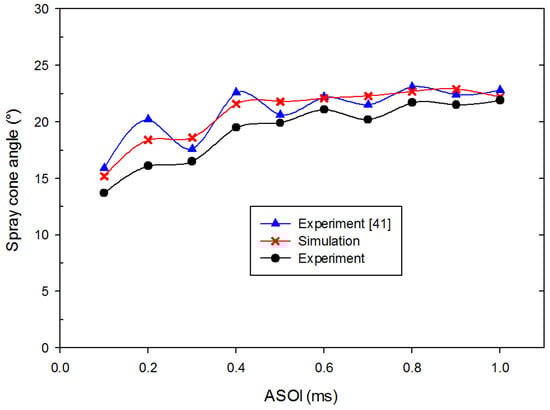 Figure 11 depicts the spray cone angle for a circular nozzle shape with 50 MPa of pressure and 3 MPa of backpressure for the experiments and simulation. It can be seen from the graph in Figure 11 that the simulation results are quantitatively consistent with the experimental results, and the average discrepancy between experiment by Yu et al. [41], and the current experiment and simulations was within about 3.8% and 7.1%, respectively. Based on the assessment, the advantage of the simulation with Fluent was verified for sufficiently handling the spray formation behaviour. Thus, the present modelling methodology gave reliable predictions for the spray formation behaviour.