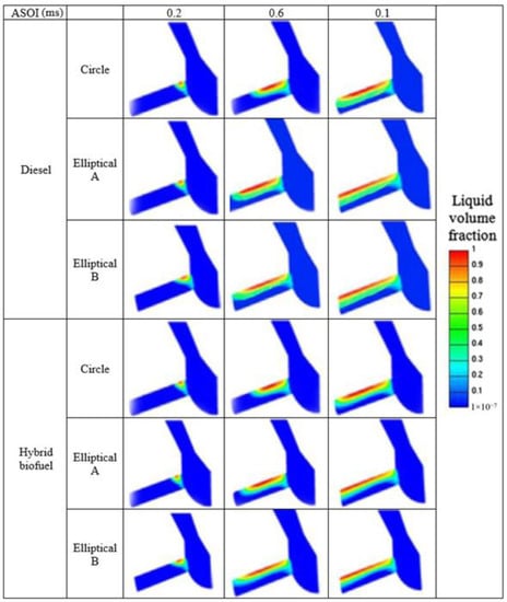 Figure 12 shows the cavitations flow in the diesel nozzle for three different nozzle shapes (circle, elliptical A, elliptical B) and two different fuel (diesel, hybrid biofuel) with the same injection pressure (180 MPa) over a different time. In the figure, the red regions contain 100% of liquid fuel and the blue regions contain pure gaseous fuel. It is apparent from Figure 12 that the cavitations intensity was more intensive for elliptical A and elliptical B as compared to the circle nozzle shape at the same injection time. Furthermore, the volume fraction of gas was comparatively bigger for elliptical A and elliptical B at the same injection time as compared to the circle nozzle shape. In this study, the aspect ratio of the elliptical nozzle shape was found to affect the cavitations flow. The elliptical B cavitations intensity was more intensive than the elliptical A nozzle shape. This discrepancy could be attributed to the cavitations region that developed near the zone where the fuel flowed back into the nozzle bore. The elliptical nozzle shape decreased significantly compared to the initial vapor production due to aerodynamic effects and greater local pressure, thus leading to greater cavitations flow. From the data in Figure 12, it can also be seen that diesel gave only marginally wider regions of vapour formation. The cavitations zones were small because of the injector experiencing a very high range of pressure. Generally, in terms of the cavitations flow perspectives, the diesel and hybrid biofuel acted in the same way.