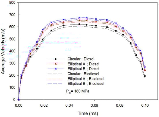 In order to compare and get a better understanding of the injection cavitations evolution, the transient average liquid velocity in the nozzle for the two fuels and the three nozzle shapes at the outlet plane is shown in Figure 13. From the graph in Figure 13, it can be seen that the average velocity for both elliptical A and elliptical B were higher than that of a circular. This is because the elliptical nozzle shape can hold larger droplets, which contributes to the higher starting momentum when compared to circular nozzle shape. In addition, the average velocity was increased as the aspect ratio of the elliptical nozzle shape increased. Despite that, the average velocity for diesel was higher than that of hybrid biofuel under the same nozzle shape. It seems possible that these results were obtained due to diesel having much lower viscosity as compared to the hybrid biofuel. Thus, this increased the coefficient of discharge, and consequently the exit velocity.