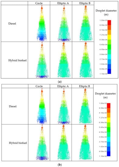 - The droplet size of the elliptical nozzle shape was smaller compared to the circular shape due to higher aerodynamic effects found in the elliptical nozzle shape that could reduce the droplets size, and thus leading to a bigger cloud formation after the secondary breakup. The evidence from this study suggests that the droplet size became smaller when the pressure was increased for both diesel and hybrid biofuel