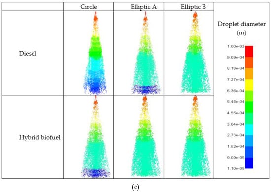 Figure 14 illustrates the spray images for circular, elliptical A, and elliptical B nozzle types at different injection pressures (50 MPa, 100 MPa, 180 MPa) and a backpressure of 3 MPa at 0.9 ms ASOI for diesel and hybrid biofuel (RP032MC068). Based on the obtained results, it was shown that diesel produced smaller cone angles compared to the hybrid biofuel blend, which yielded a bigger cloud after the secondary breakup for both the circular and elliptical nozzle shape. Smaller droplets and increased spray angles were discovered when the elliptical nozzle shape was utilized compared to the circular shape. This was mainly due to higher aerodynamic effects for the elliptical B nozzle shape, which could reduce the droplets size and thus lead to a bigger cloud after the secondary breakup. The droplets became smaller when the pressure was increased for both diesel and hybrid biofuel. From the observation of the spray characteristic result, the elliptical A and elliptical B nozzle shape yielded a larger cloud and slower spray characteristics for the hybrid biofuel blend, whereas a thicker and faster spray was produced for diesel fuel. Furthermore, the droplets became smaller when the pressure was increased for both diesel and the hybrid biofuel. The capability of the simulation to anticipate such occurrences was caused by the comprehensive modelling in the thick main area where the primary breakup happened.