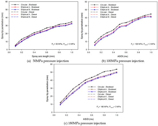 Spray tip penetration under different pressures: (a) 50 MPa pressure injection, (b) 100 MPa pressure injection, and (c) 180 MPa pressure injection.