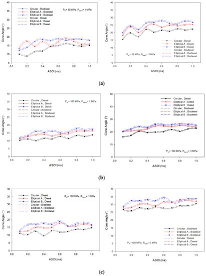 The spray cone angles were plotted versus ASOI in Figure 16 in order to give a better understanding and compare the performance of different nozzle geometry on spray cone angle under real engine conditions and high-pressure circumstances. Figure 16 illustrates that when the backpressure was increased, the spray cone angle also increased for all nozzle spray shapes. For the elliptical nozzle shape, the aspect ratio of the elliptical nozzle shape was found to influence the spray cone angle. The spray cone angle for elliptical B was found to be much higher than that of the elliptical A. However, the elliptical A spray cone angle was greater than that of elliptical B for the initial process. Later, the spray cone angle for elliptical B increased to be identical or lower for the end process of the spray. From these results, it appears that the elliptical nozzle shape experienced an axis-switching phenomenon in a diesel engine with high pressure conditions. These results obtained from the current investigation are consistent with the spray width results below. Furthermore, it can be seen in Figure 16 that the spray cone angle of the circular nozzle shape was smaller than that of the elliptical nozzle shape. This discrepancy could be attributed to aerodynamic effects of the elliptical nozzle shape, which had a bigger cross section and spray surface area than the circular nozzle shape. Another possible explanation for this is that the elliptical nozzle shape experienced an axis-switching phenomenon, which is crucial to boost the ratio of the air entrainment [43] and consequently leading to larger spray cone angle. In addition, the type of fuel on the different nozzle shape has a small effect to the spray cone angle although the diesel fuel gives a slightly higher spray cone angle than of hybrid biofuel blends. Based from the obtained results, it was shown that diesel produced smaller cone angles as compared to a hybrid biofuel blend, which yielded a bigger cloud after the secondary breakup than all the nozzle shapes. This happened due to the larger viscosity of hybrid biofuel as compared to diesel, which caused unstable spray and droplets that effects the production of the spray characteristic.