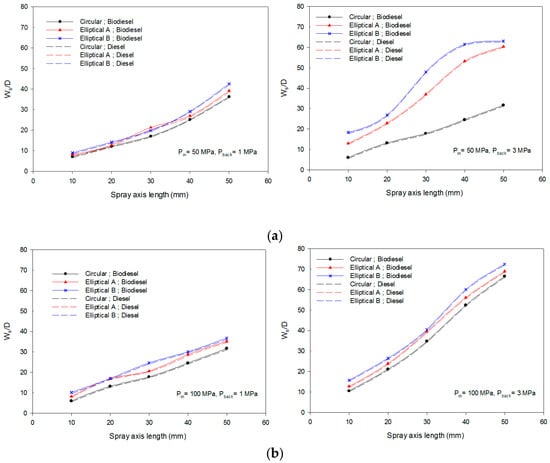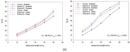 The ratio of spray width (WS) over the nozzle hydraulic diameters (D) has been used to compare the data of spray width. The spray widths were taken into account to compare the spray characteristics of different nozzle shapes under the real diesel engine and high-pressure conditions. Figure 17 displays the results of spray width (WS/D) along the spray axis length. As can be seen from Figure 17, the spray width of the elliptical A and elliptical B nozzle shapes was much larger than that of the circle shape for all pressure conditions. Furthermore, the spray width of elliptical B was much bigger than the elliptical A nozzle shape. These results showed that the superior spray atomization and bigger spray cone angle could be achieved by using elliptical A and elliptical B nozzle shape compared to a circular nozzle shape. From the graph in Figure 17, it is apparent that the elliptical A and B spray widths were fluctuating along the spray axis length. This investigation shows that elliptical A and elliptical B experienced an axis-switching phenomenon under the real diesel engine and high-pressure conditions. What is interesting in this data is that as the backpressure was increased with the same injection pressure, the axis-switching phenomenon of the spray width decreased. The current study found that the aerodynamic effects could be boosted by increasing the backpressure. Another important finding was that the high-pressure conditions were useful to reduce the axis-switching phenomenon. All the nozzle shapes demonstrated higher spray width when the injection pressure was increased. It seems possible that these results were due to a higher difference between inlet and outlet velocity and steady air and fuel interaction were achieved when the spray velocity became greater under a higher injection pressure. These findings of the current study were consistent with those of Abramovich [44] who found that axis-switching was due to pressure differentials in the plane of the vortex ring.