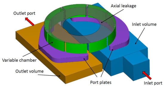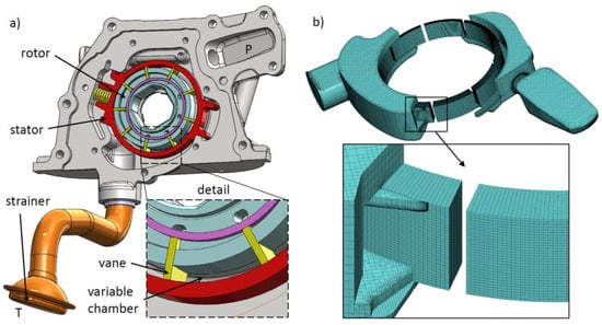 The study was carried out on a 15.4 cc/rev variable displacement pump for engine lubrication, shown in Figure 1a without the cover. The rotor houses nine vanes, and is driven directly by the engine crankshaft. The tips of the vanes are in contact against the stator track, whose center is eccentric with respect to the rotor axis. The eccentricity can be modified due to the linear movement of the stator by means of the delivery pressure acting on one of the two prismatic guides. For the present study, the pump was modelled at fixed positions of the stator; hence, the displacement control was not simulated.
