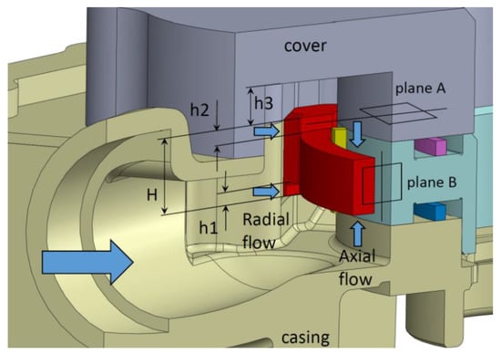 In Figure 2 and Figure 3, the geometric parameters of the stator are indicated. The analyzed configurations are reported in Table 1. In Configuration 1 (original) the cover was flat, and the variable chambers are fed only from the casing side; moreover, a cutting with height h1 = 2 mm was machined on the stator in order to increase the flow area in the passage below the stator itself, and to allow radial feeding into the chambers. In Configurations 2, 3, and 5, an additional milling with height h2 on the opposite side of the stator was also present, to increment the radial flow. In configurations 4 and 5, an additional flow area with height h3 was obtained in the cover to allow for double axial feeding. Finally, in Configuration 6, the chambers were fed only from one side, as in the baseline, but without the cutting with height h1 on the casing side.