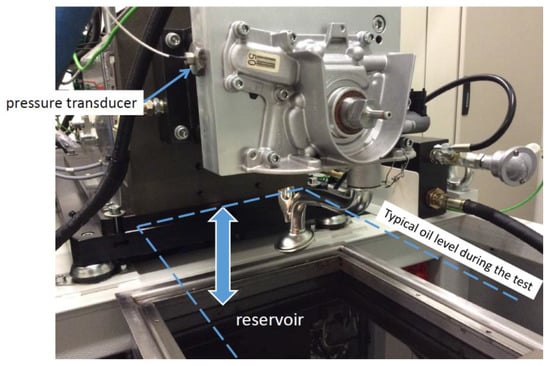 Photo of the pump mounted on the test rig with the indication of the oil level when the reservoir is positioned in the test mode.