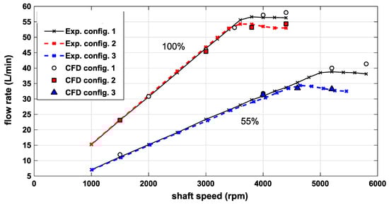 The tests were performed at fixed displacement, at constant absolute delivery pressure of 0.3 MPa and at an oil temperature of 40 °C. The spring of the displacement control was removed, and the stator was mechanically blocked, by means of metal spacers, at maximum eccentricity and at 55% of the maximum. The shaft speed was incremented gradually up to the region of incomplete filling, and the delivery flow rate was measured for each value of angular speed. The original stator (Configuration 1) and the version with the milling with height h1 = 1 mm (Configuration 2) were tested at maximum displacement, while the original configuration was also compared with Configuration 3 (h2 = 2 mm) at partial displacement. The maximum speed was limited to about 1000 rpm above the speed of beginning of the incomplete filling, due to the extremely high-pressure oscillations caused by the intense backflow. For the same reason, the tests were performed at low delivery pressure. The experimental measurements and the CFD simulations (dots) are reported in Figure 6.