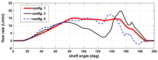 In Figure 7, the instantaneous flow rate entering a chamber as function of the shaft angle is plotted for Configurations 1, 3, and 4 at 5200 rpm. The behavior was very similar up to about 70 degrees, while in Configuration 4 at the end of the suction phase, a backflow was observed. In Configuration 3, in which the double feeding is obtained through the milling on the stator, the flow rate was significantly lower in the middle of the suction phase, with an improvement only at around 150 degrees.