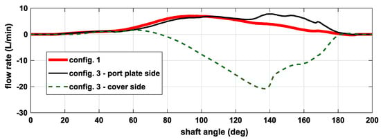 Total instantaneous flow rate entering a chamber (positive if ingoing) as a function of the shaft angle for three different configurations.