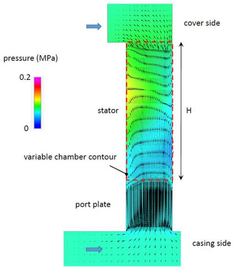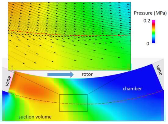 The figure shows a cut plot in correspondence of the plane A (shown in Figure 2) in the middle of the milling with height h2, and perpendicular to the shaft. The boundary of the chamber connected to the inlet volume is indicated by the dashed red line. It can be observed that in front of the trailing vane, the pressure was higher than in the suction volume, while in the region behind the leading vane, the pressure was very low; in this part of the chamber, the gaseous phase was localized. The high pressure in the chamber, together with the centrifugal force acting on the oil, generated the backflow, as demonstrated by the direction of the velocity vectors plotted in the detail. Hence, in this pump, the contribution of the centrifugal force was significant with respect to the force generated by the pressure gradient, and due to the small axial height, the fluid could escape in correspondence with the outer edge of the chambers.