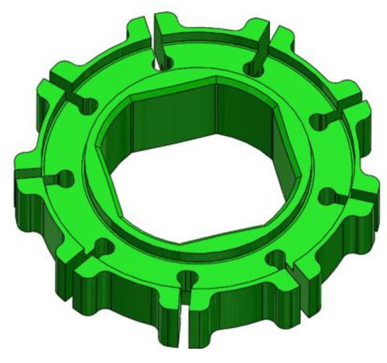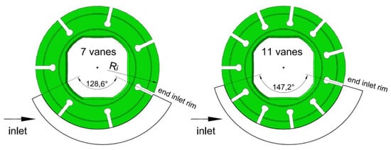 For assessing the influence of the number of chambers, two new rotors were designed with seven and 11 vanes, as shown in Figure 12. The port plate was modified accordingly in order to have an ideal timing in all configurations. This means that the connection and the separation of the generic chamber with the suction side occurred exactly at the positions of minimum and maximum volumes. It is straightforward that, regardless of the number of chambers, the filling can be further improved by means of a non-ideal timing; in particular, by delaying the closing of the suction port, as reported also in []. However, in this study, only the influence of the number of chambers is highlighted. All other parameters have remained the same, as in the reference pump with nine vanes. Since the pump displacement was slightly influenced by the number of chambers, the displacement of the pump with 11 vanes is 1.3% smaller than in the pump with seven vanes, with a difference in terms of theoretical flow rate at 5000 rpm of 1 L/min.