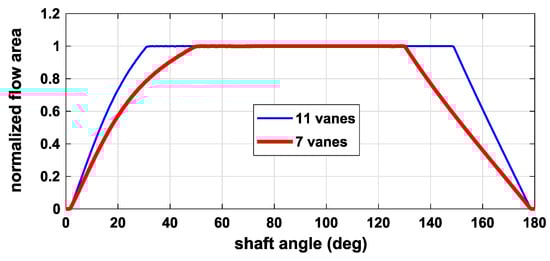 Normalized flow area with seven and 11 vanes. The position of 0 degrees corresponds to the minimum volume of the chamber.
