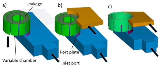 The flow area can be further increased through the radial feeding of the chambers. In gerotor pumps, it is possible to make a hole in each chamber between two teeth on the outer diameter of the external gear []. In vane pumps, quite a large hole or a cutting [] can be manufactured on the stator. However, at high speeds, the effect of the centrifugal force that tends to move the fluid against the stator track plays an important role in the efficiency of the radial feeding. In fact, the additional flow areas do not always have beneficial effects on the pump filling, since the fluid could find a preferred path for leaving the chamber, as preliminary studies have demonstrated [].