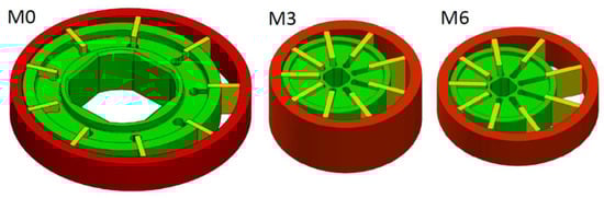 The last parameter analyzed is the eccentricity. Starting from the rotor with small diameter simulated in the previous section (M3), and with an axial thickness equal to the reference pump (M0), the eccentricity, and the stator diameter have been increased, in order to obtain the same displacement (Table 6). In this way, the pumping area, defined as the ratio between the displacement and the axial height, has been incremented. In Figure 17, the comparison between the configurations M0, M3, and M6 is shown. It must be noted that the unit M6 was used only to highlight the effectiveness of the increment of the eccentricity in the fluid dynamic model. In fact, the excessive extension of the vanes, with respect to the slots in the rotor, would cause serious kinematic and mechanical issues.