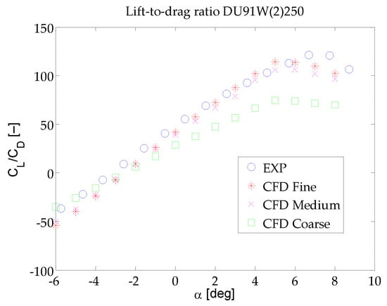 Results of the lift-to-drag ratio with each mesh level of the numerical simulations (CFD) vs. the experimental data of the DU91W(2)250 clean airfoil without the implementation of any GF.