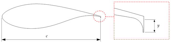 The position and size of the GF is displayed in Figure 3. The dimension c represents the airfoil chord length and the dimension y the GF length. Twelve cases have been considered depending on the GF length, which is expressed as a percentage of the airfoil chord length, as shown in Table 2. Each case has been studied for fifteen different angles of attack, from −6° to 8°. The combination of all these GF positions for each angle of attack gives 195 different cases to study. All these cases have been designed following the procedure of previous studies carried out by Fernandez-Gamiz et al. [,]. The airfoil without any flow control device was also taken into account and simulated in order to compare the influence of the GFs on the airfoil aerodynamic performance.