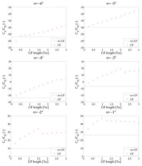 The influence of the GF length was evaluated with the lift-to-drag ratio CL/CD for every angle of attack α studied, as illustrated in Figure 4. For each AoA, the evolution of the lift-to-drag ratio CL/CD with the GF length was compared with the clean airfoil case, i.e., no GF implementation. With regard to negative AoAs, from −6° to −4°, as the GF length increases the lift-to-drag ratio increases as well. In all these cases the effect of the GF enhances the aerodynamic efficiency of the airfoil, except for the case of −6° with a GF length of 0.25% c. However, in the range of AoAs from −3° to −1°, a peak value of CL/CD is achieved before the maximum GF length of 3% c. For −3° of AoA, a CL/CD ratio of 18.99 was obtained with a GF length of 2% c. Similarly, the peak values of CL/CD for −2° and −1° of AoA correspond to GF lengths of 1.5% c and 1% c, respectively.