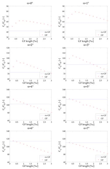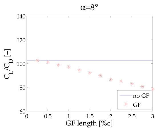 The optimal GF length varies at different angles of attack, which means that a fixed GF length would not reach the optimal CL/CD ratio at all the AoAs. Therefore, this result suggests that a careful analysis of the GF length is needed to yield an efficient flow control system and to consider the study of GFs as active flow control devices. In that case, the GF length would change along the AoA to achieve the best CL/CD ratio depending on the working conditions.