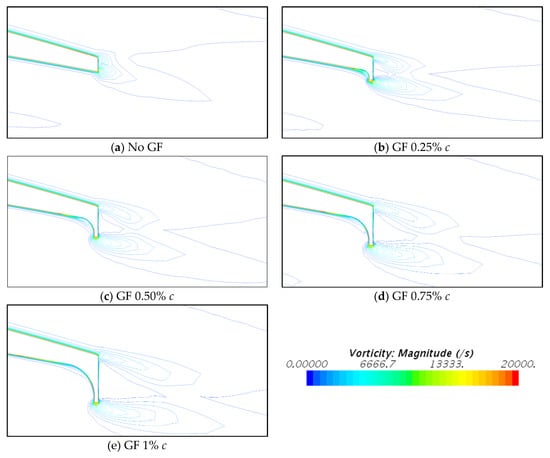Streamwise vorticity fields for the case without GF and GF lengths of 0.25% c, 0.50% c, 0.75% c and 1% c at an angle of attack α = 0°.