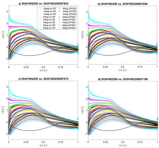 Pressure coefficient cp comparison between the clean airfoil DU91W2250 (no GF) and the best cases: (a) DU91W(2)250GF025; (b) DU91W(2)250GF050; (c) DU91W(2)250GF075; (d) DU91W(2)250GF100.