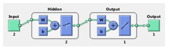 Once studied the influence of different GF lengths and angles of attack in the airfoil aerodynamic performance by means of CFD techniques, a prediction model has been developed with an artificial neural network (ANN). The aim of this model is to predict the aerodynamic efficiency (CL/CD ratio) of the airfoil following the strategy based on the study by Lopez-Guede et al. []. In the current study, a multi-layer model with two hidden layers has been used. The CL/CD ratio is obtained by Equation (3), whereas the outputs of each hidden neuron follow a sigmoid function as defined in Equation (4). All these parameters represent a typical configuration of Multilayer Perceptron with Backpropagation (BP-MLP) neural networks. The postsinaptical hi of each i neuron is calculated using a linear combination by means of Equation (5), where ωi denotes the output layer weights and ωij the input (hidden) layer weights: