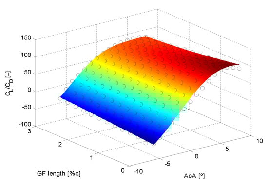 Figure 8 shows the ANN results for all GF lengths and all AoAs studied in the present work. The colored surface illustrates the CL/CD values calculated by the proposed ANN and the CFD results are represented by black asterisks. The neural network predicts accurately the lift-to-drag ratios obtained by the numerical computations.