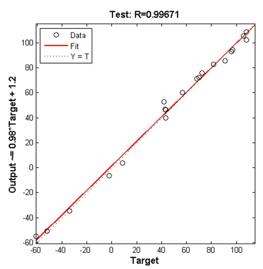 The correlation coefficients (R-value) are shown in Figure 9. The regression line (highlighted in red) is drawn over expected CL/CD ratio and its neural prediction. The horizontal axis shows the expected CL/CD ratio and the vertical axis the CL/CD ratio prediction given by the neural network. The correlation coefficient value was determined as 0.99671 which indicates a good correlation between the results given by the ANN and the followed target. This result for the simulated GF lengths allows the algorithm to calculate and predict the CL/CD ratio for any GF length in the conditions studied of Reynolds number Re = 2 × 106.