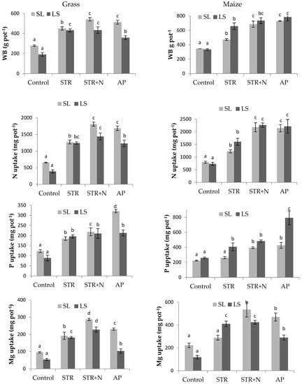 Yields (WB—Wet Basis) of maize and grass (sum of of three mowings) on two types of soil: silty loam (SL) and loamy sand (LS) and N, P, Mg uptake by crops on objects fertilized with: struvite from bio-refinery—STR; struvite from bio-refinery and ammonium sulfate (commercial)—STR + N; ammonium phosphate (commercial)—AP and on control treatment—without fertilization (Control). The standard deviation within each treatment (n = 3) is indicated by the line extending the column. (a–d) Homogeneous groups. Values followed by the same letters in the column (separately for soils: SL and LS) are not statistically different (Tukey HSD multiple range test, 95.0% significance, P < 0.05).