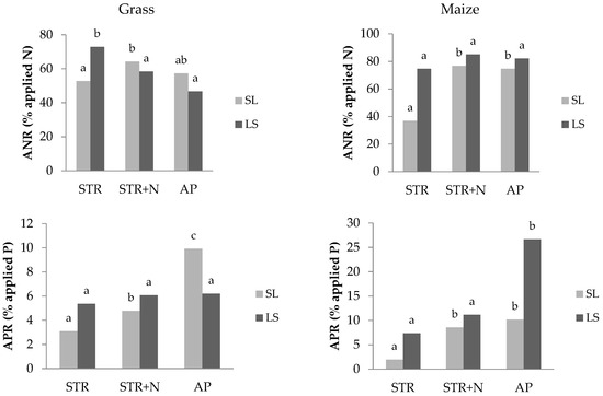 Apparent recovery of applied N (ANR) and P (APR) in maize and grass (%) at SL and LS soils. a, b, c—homogeneous groups. Values followed by the same letters in the column (separately for soils: SL and LS) are not statistically different (Tukey HSD multiple range test, 95.0% significance, P < 0.05).