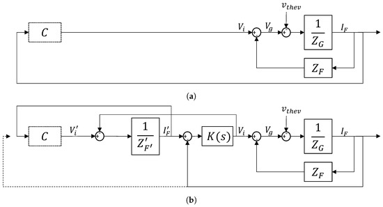 Diagram of the output dynamics seen by the virtual oscillator for voltage-sourced and current-controlled systems. The oscillator controller C is not modified, and is shown with a dashed border. The remainder of the system is shown as a linear transfer function block diagram. The filter impedance is for the hardware filter or for the virtual filter. The grid (either G or ) is treated as its Thévenin equivalent with impedance and voltage . The current controller (e.g., a PI controller) is . The various impedances are all functions of s. (a) Voltage-sourced inverter block diagram. In the base derivation, the virtual oscillator control (VOC) controller C receives a current feedback measured at the inverter output. (b) Current-controlled inverter block diagram. In the base derivation, the VOC controller C receives a virtual current feedback based on the virtual filter. Alternatively, one could use the feedback of the actual current , shown as a dashed line.