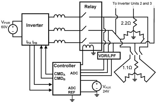 One inverter subunit coupled to a Y-connected load. The inverter’s control signal reference and its negative DC rail are isolated. The negative DC power rail of each inverter floats in isolation. Each subunit’s controller reads and , the load voltages on phases A and B, and receives feedback of the amplifier output current. Additional inverter subunits are connected in parallel to the load for synchronization testing. The inverter can be either voltage-sourced and receive a voltage command, or current-controlled with a current command [20].