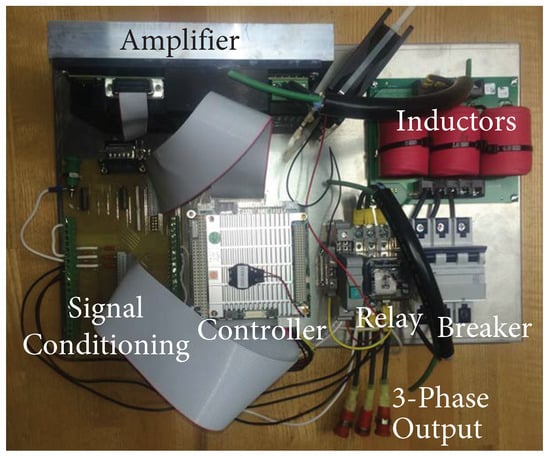 The three-phase testbed consists of three inverter subunits connected in parallel to a Y-connected resistive load. The general configuration is identical for both current- and voltage-controlled inverters. Figure 6 shows one inverter subunit connected to the load, and displays the core functional elements of the subunit. A picture of this unit in the physical testbed is shown in Figure 7 without the attached load.