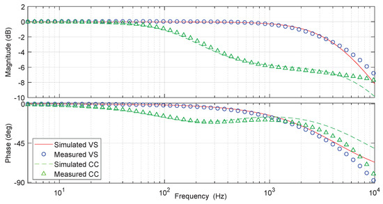 Amplifier Bode plots in simulation and hardware for both voltage-sourced (VS) and current-controlled (CC) inverters. In all cases, the amplifier is connected through a 150 H inductor to a Y-connected resistive load. The voltage transfer function is measured as voltage command to current response, and scaled by the resistance () to produce 0 dB at low frequencies.