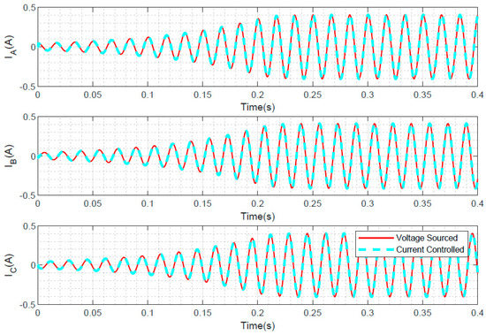 The current-controlled amplifier response is shown as the transfer function from current command to current output. In this case, both real and simulated current controllers show good tracking until a dB bandwidth of about 200 Hz, when the response no longer tracks the command. So for this system, both simulation and hardware tests indicated that the current-controlled and voltage-sourced systems should be equivalent for frequencies below about 100 Hz. This should suffice for the steady-state behavior of oscillators set for 60 Hz. Rapid transients may cause the two versions to diverge somewhat.