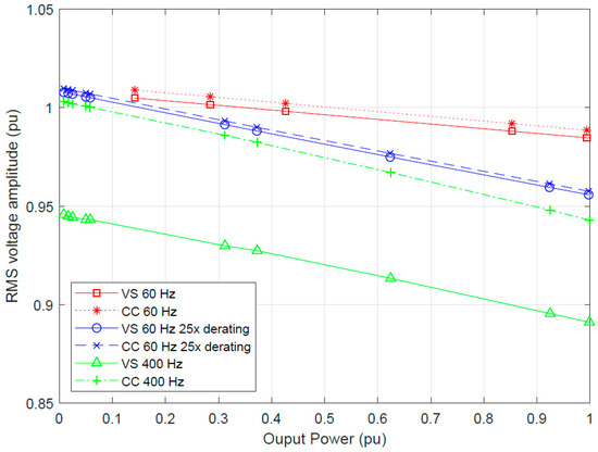 Simulated droop characteristics for voltage-sourced (VS) vs. current-controlled (CC) inverters for two different nominal ratings at 60 Hz and and one rating at 400 Hz. As expected, the two equivalent VS and CC formulations perform almost exactly the same for both ratings at 60 Hz, but they diverge at 400 Hz because it is beyond the current controller bandwidth shown in Figure 8. A derating by a factor of 25 is implemented by artificially scaling the current feedback to the oscillator, which creates a different droop characteristic [17,18,19].