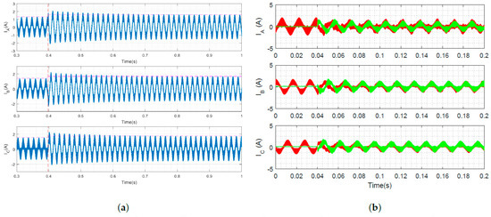 To demonstrate stability through rapid step-changes in load, two synchronized, identical inverters were equally sharing the load, and the load resistance was switched from a Y-connected to (66% decrease) on each phase, as shown in Figure 14a. These two inverters have identical virtual output impedance , and thus share load equally. They tolerate the change and maintain synchronization.