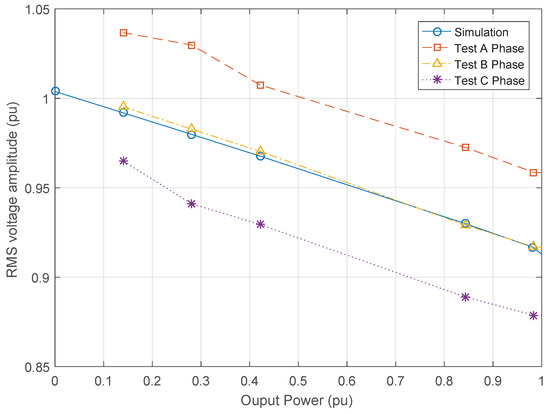 Finally, the DZO dynamics yield a droop characteristic where the output voltage drops in the presence of increasing load. The predicted and experimental results are shown in Figure 12. The simulation results are perfectly symmetric and all three phases yield the same voltage, current, and power magnitudes. The experimental results indicate some discrepancy between phases, but the general trend is the same. The output power is calculated based on the load resistance and the nominal output voltage.