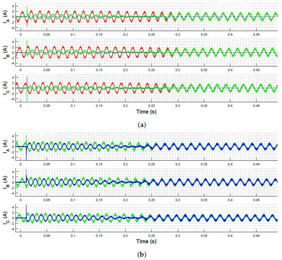 Experimental testing of current-controlled converter synchronization with DZO control. (a) One current-controlled inverter synchronizes when connected to another inverter operating at rated power. (b) Current-controlled inverter synchronizes when connected to two already-synchronized inverters. Three traces are shown (red, green, blue), but the red trace is directly under the green because they are already synchronized. A maximum load phase current of 4.64 A and a maximum inverter phase current of 8.48 A were observed in testing [20].