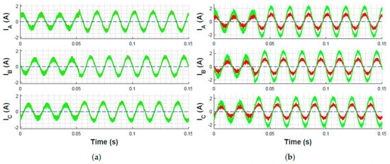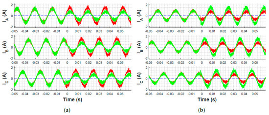 In Figure 15a, both inverters oscillate in synchronization with identical virtual output impedances until is doubled at time 0, increasing to twice . After is doubled, the output currents and continue to oscillate in phase but change magnitude, is approximately half of . This observation is consistent with (20). The opposite process, in which is halved rather than doubled, also yields the expected results in Figure 15b, with increasing to approximately twice .